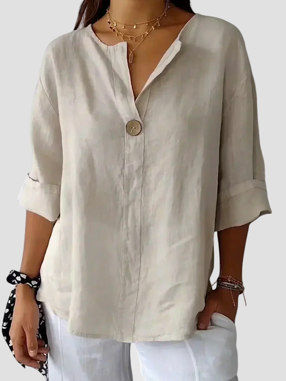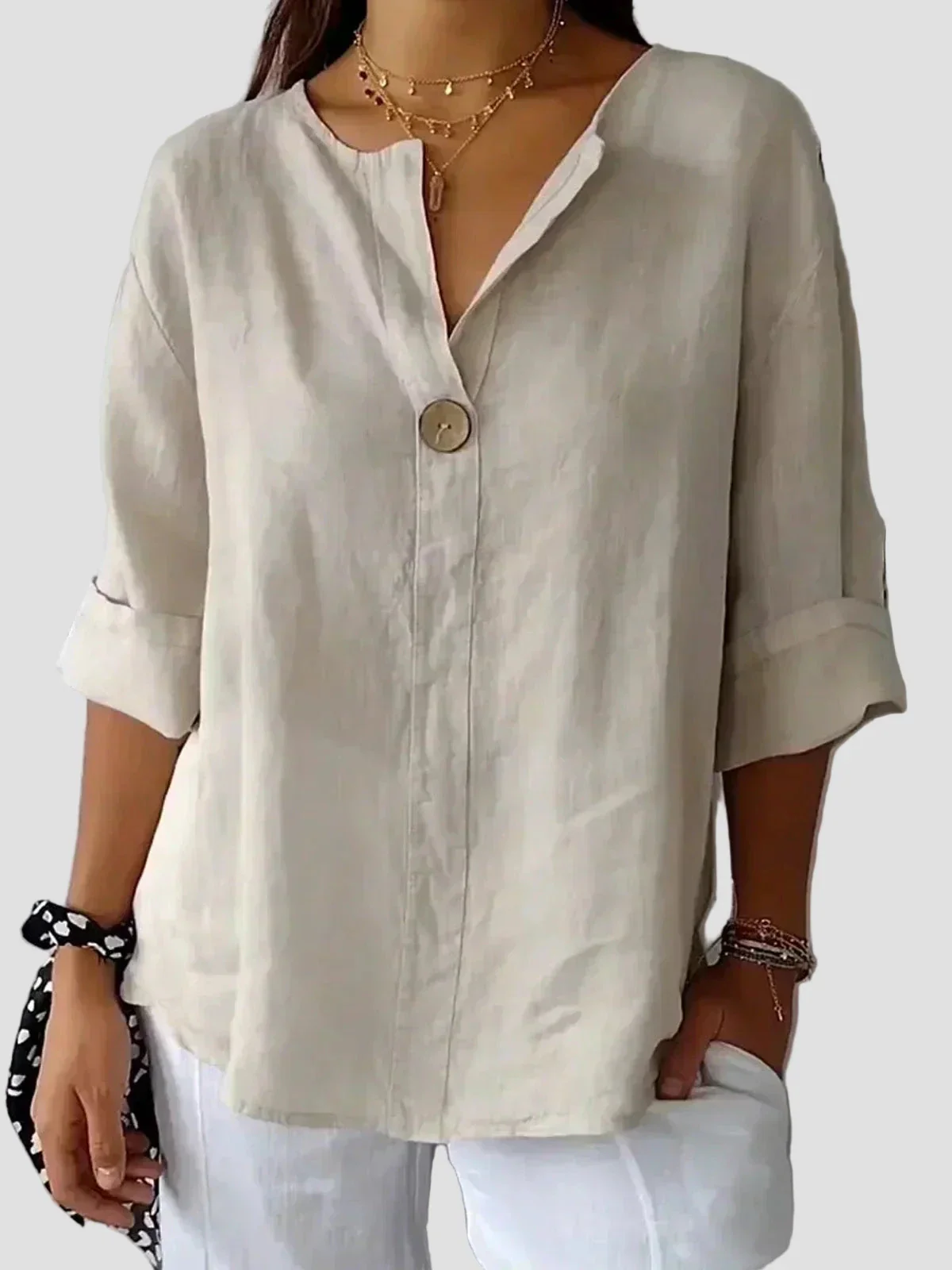 O bluză ușoară, cu o croială elegantă, perfectă pentru femeile care își doresc confort și stil în același timp. Nasturele frontal adaugă o notă minimalistă, iar mânecile rulate creează un aspect relaxat și modern. O alegere excelentă pentru zilele călduroase și anotimpurile de tranziție.