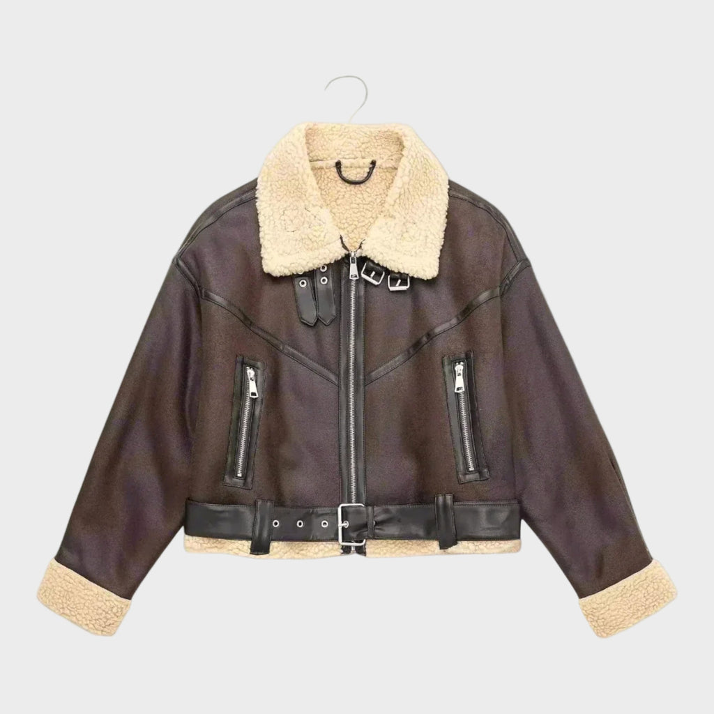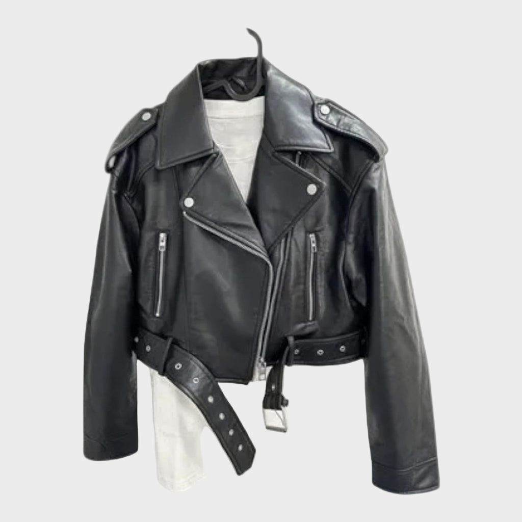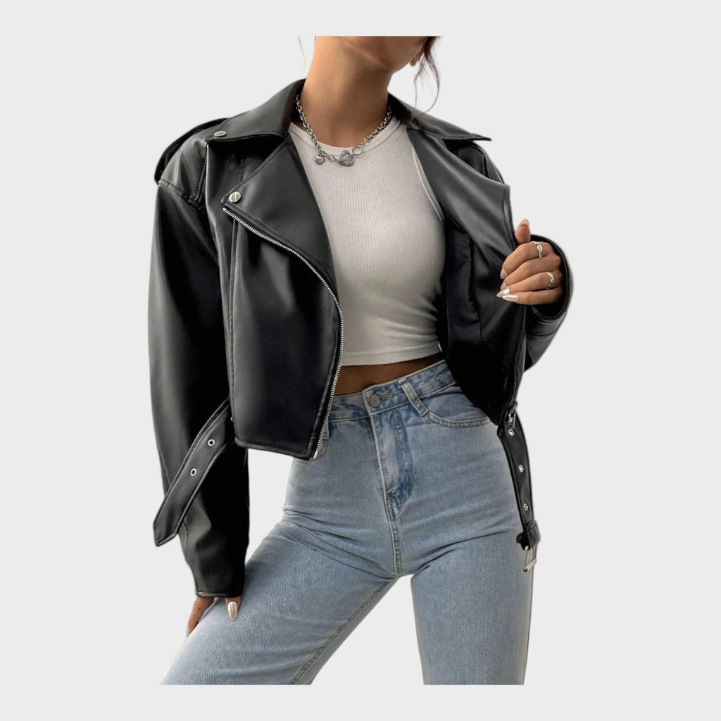 Jachetă scurtă modernă din piele cu curea și estetică rafinată