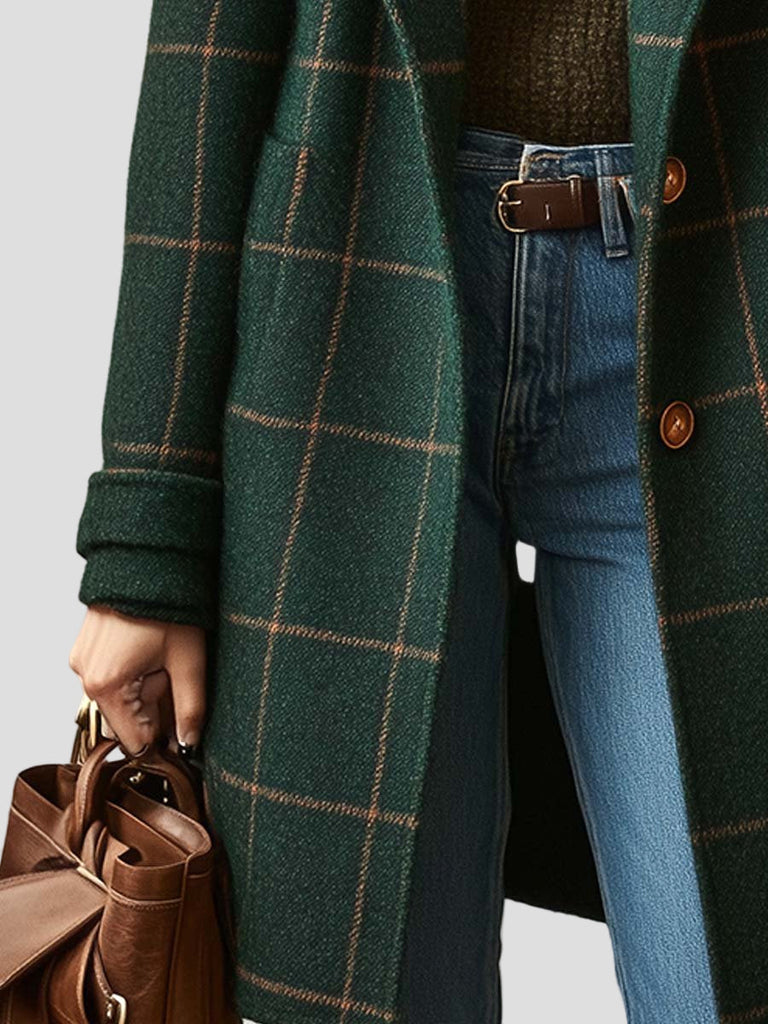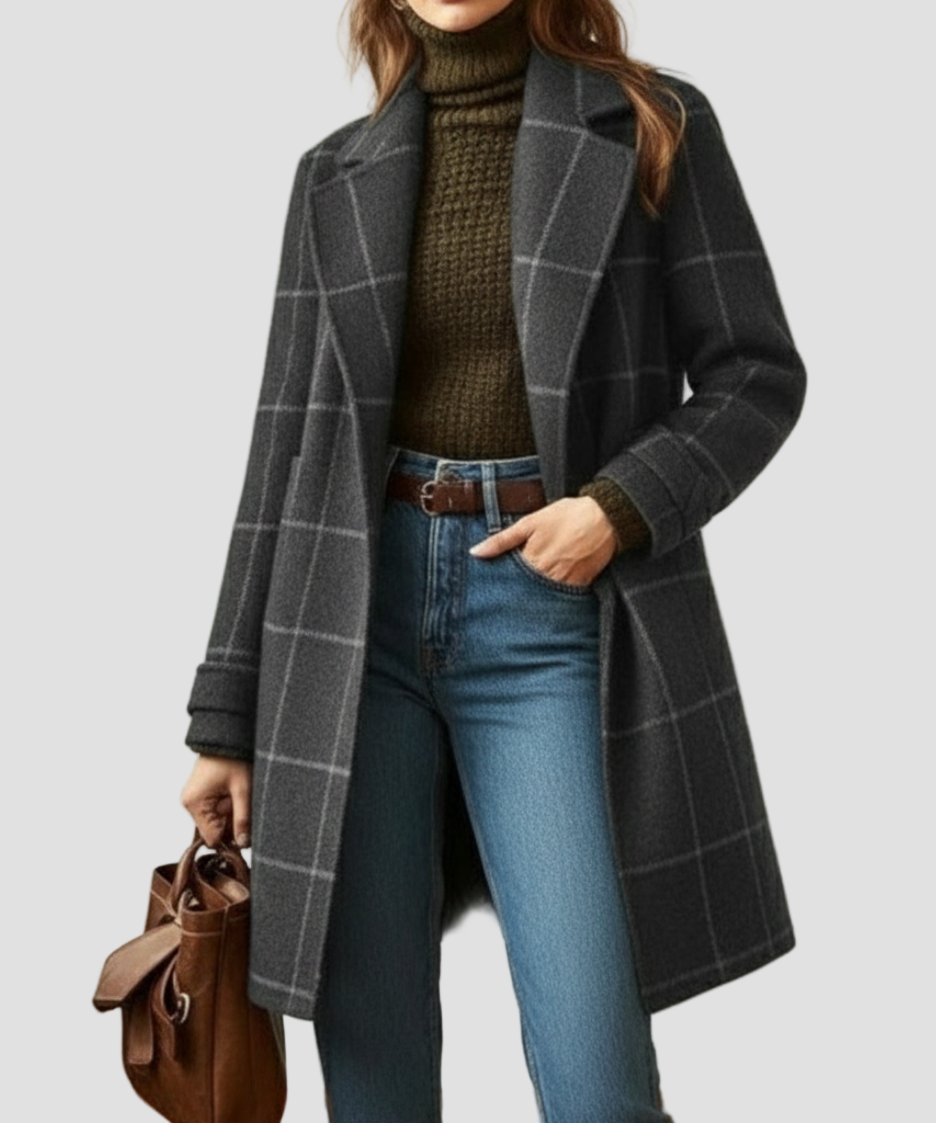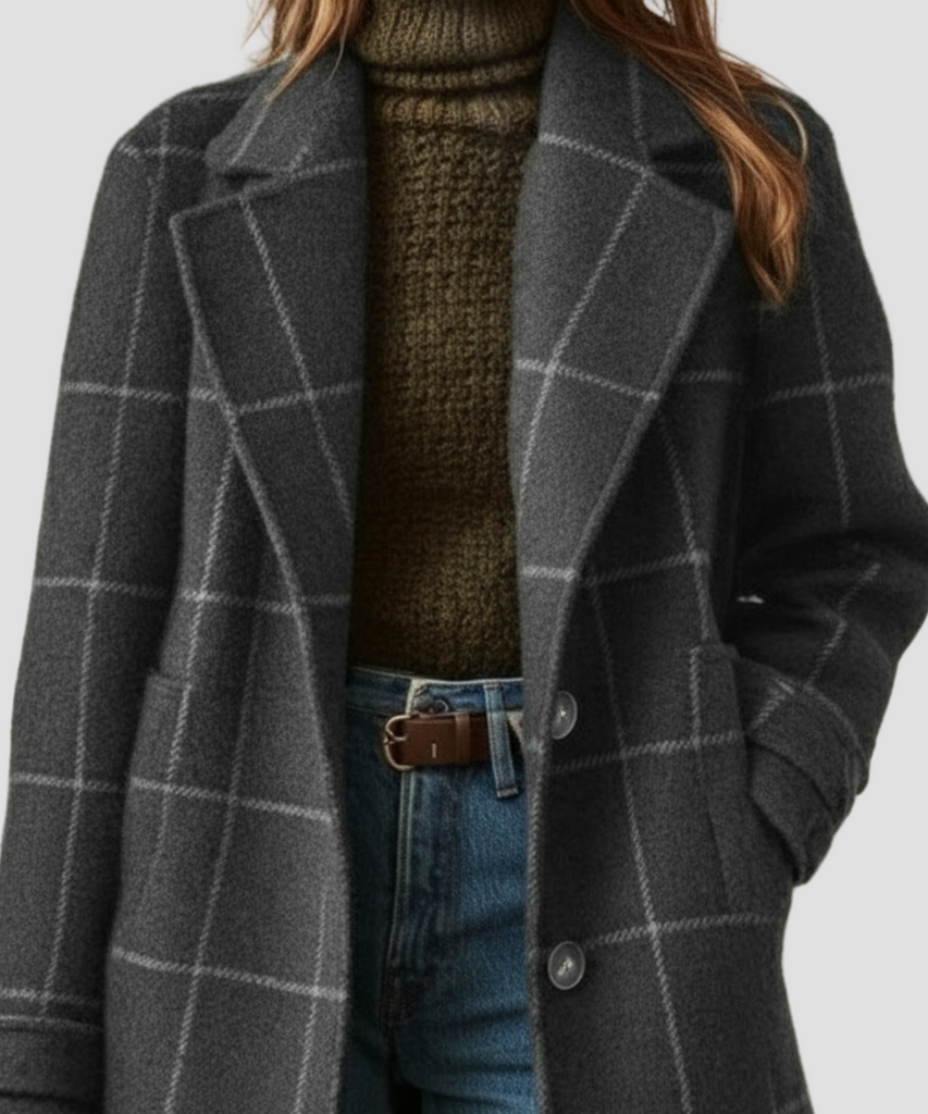 Modelul său rafinat în carouri și gulerul cu rever adaugă o notă de lux discret – acea încredere „meticulos elegantă” pe care fiecare femeie o merită.