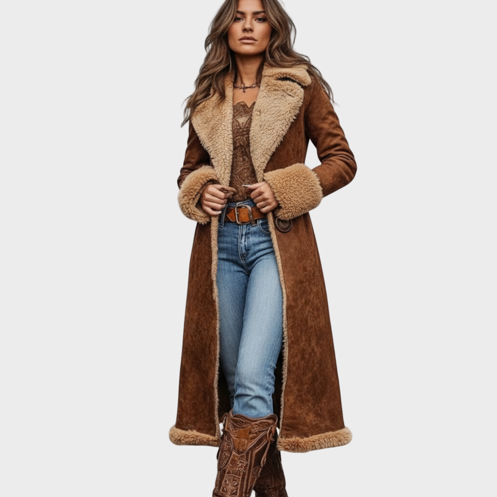 Paltonul Guylène combină căldura confortabilă a blănii cu stilul western casual. Finisajul maro moale, gulerul deschis la culoare contrastant și manșetele late creează o piesă vestimentară statement care va ieși în evidență cu blugi sau rochii. Lungimea extinsă alungește vizual silueta, în timp ce croiala confortabilă vă permite să vă mișcați liber de la cafeaua de dimineață la băuturile de seară.