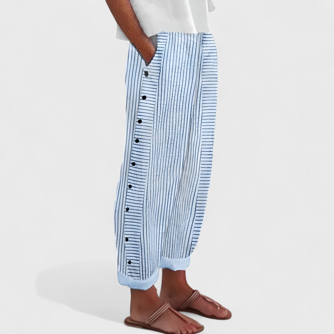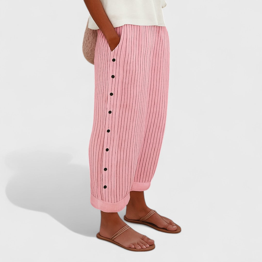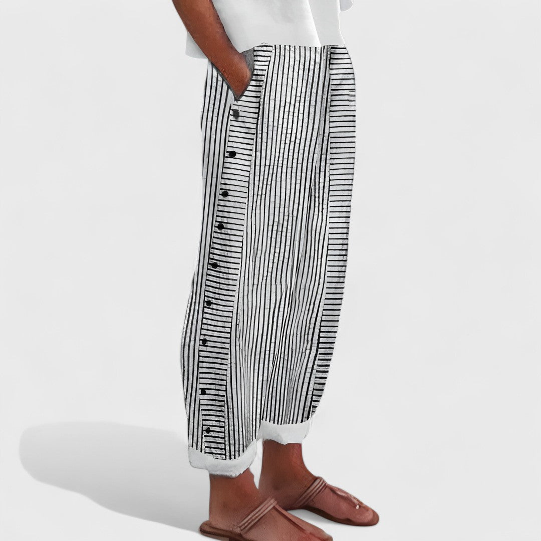 Confecționați din in fin, natural răcoros și respirabil, pantalonii Věra oferă confort, dar și un aspect îngrijit, datorită croiului lejer și benzii elastice - perfecți pentru plimbări, întâlniri de seară sau zile în care vrei să arăți elegant și să te simți bine în același timp.