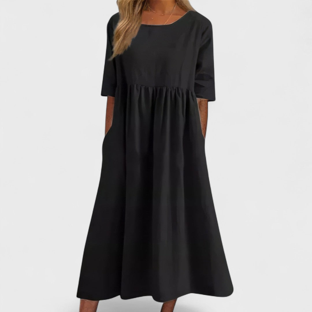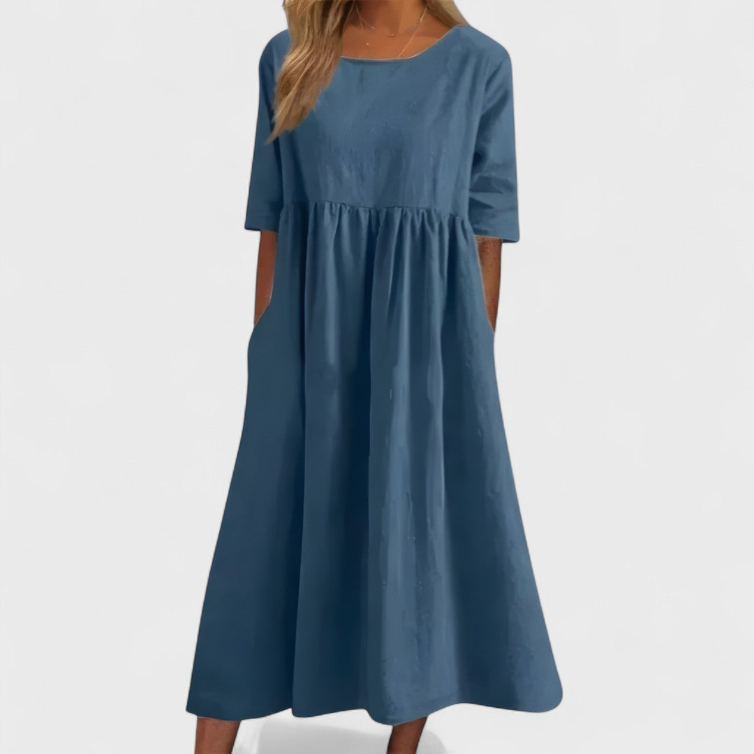 Rochia Sofia iese în evidență prin designul său minimalist, dar modern. Este confecționată dintr-un amestec de bumbac de înaltă calitate, moale, respirabil și confortabil pe piele, ideală chiar și în zilele călduroase. Croiul în linie A cu o fustă lejeră flatează în mod natural silueta, în timp ce decolteul discret adaugă un accent feminin subtil. Simplitatea modelului permite o aranjare ușoară - de la sandale la adidași sau accesorii.