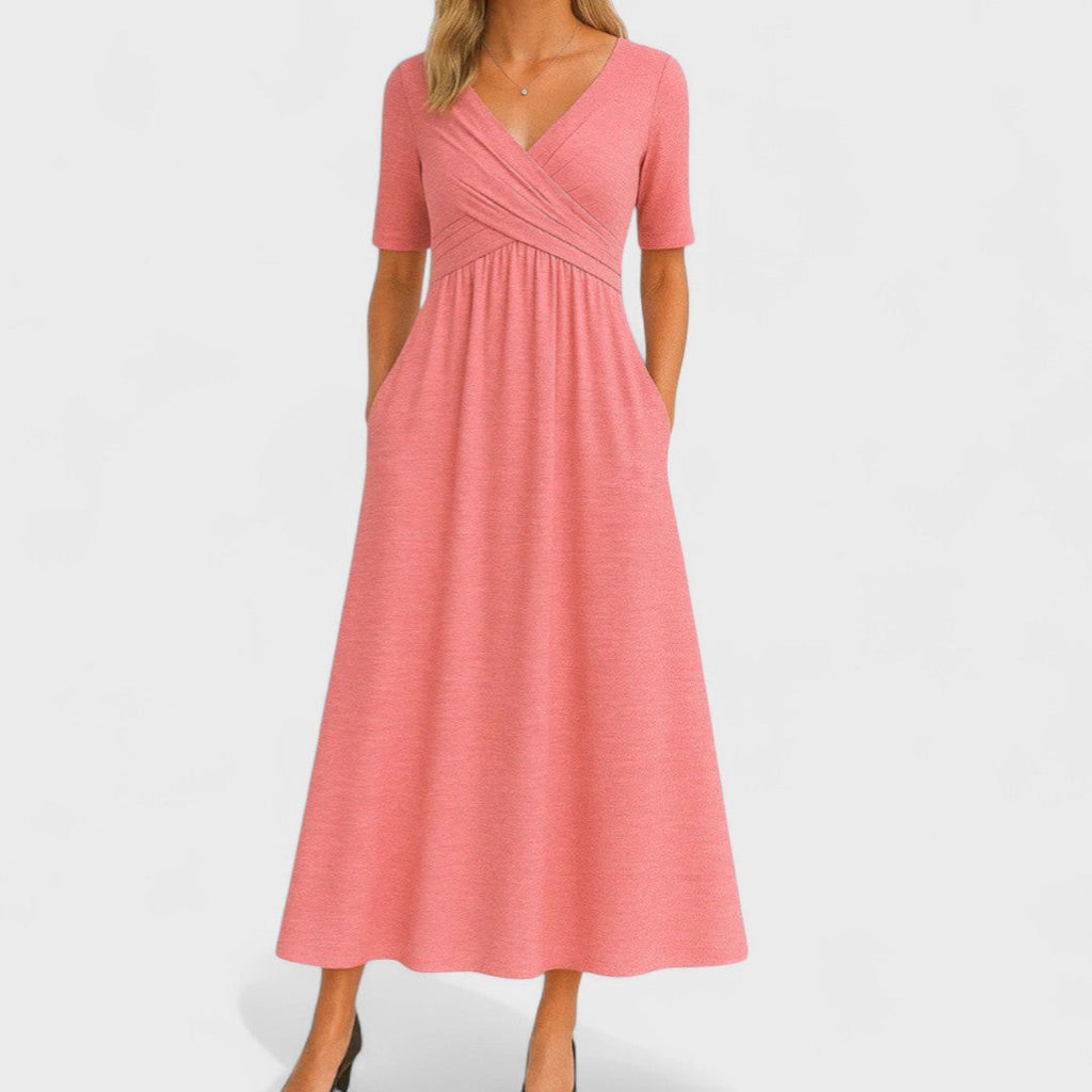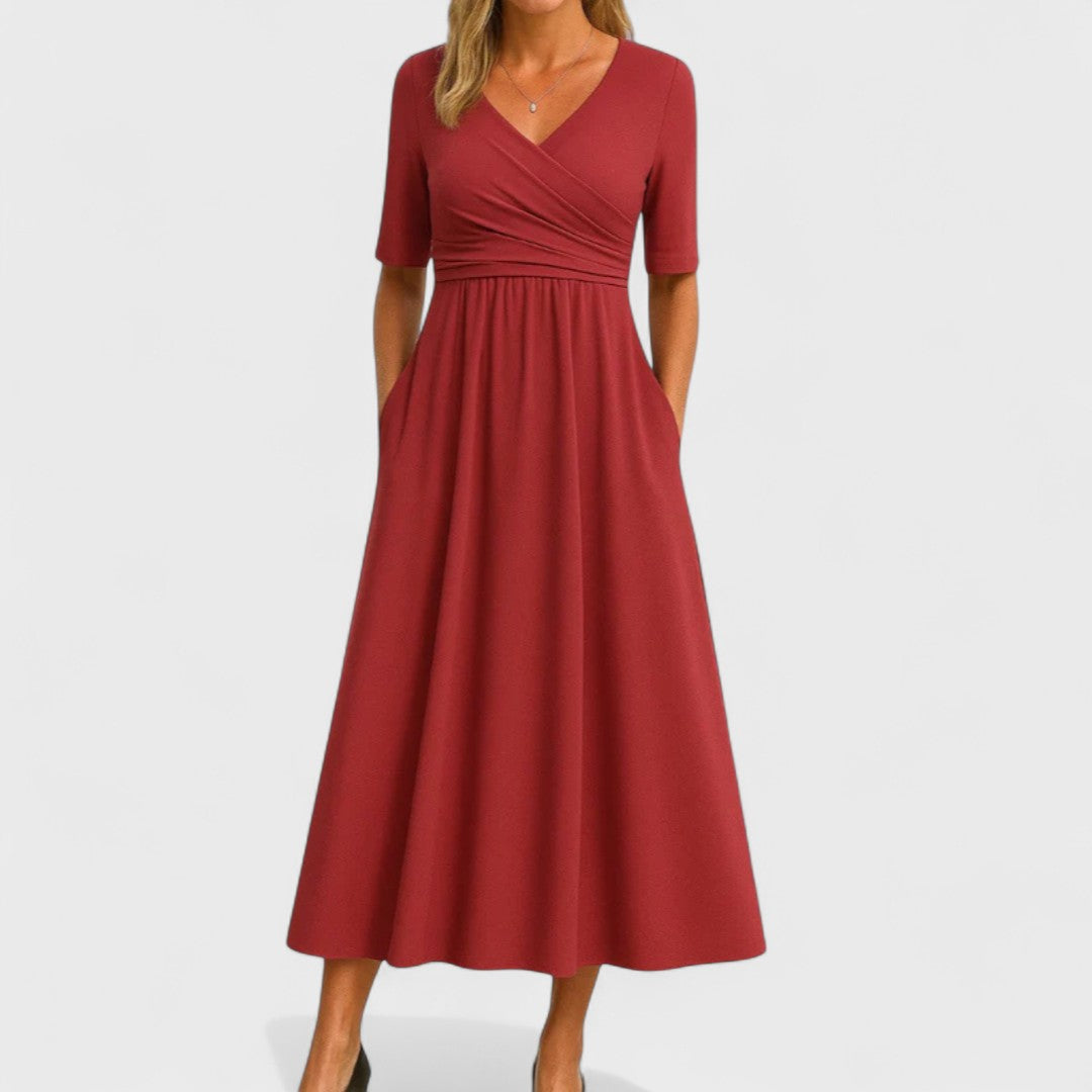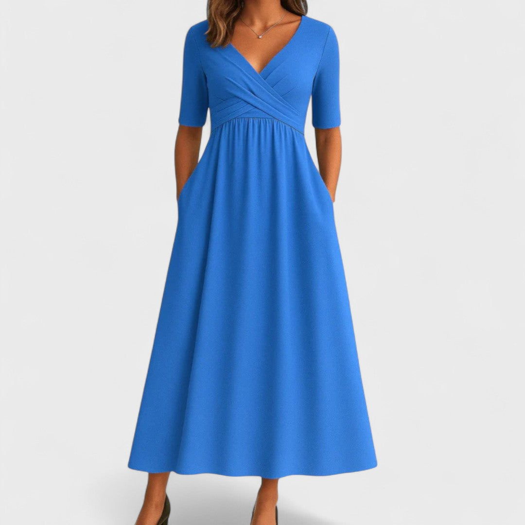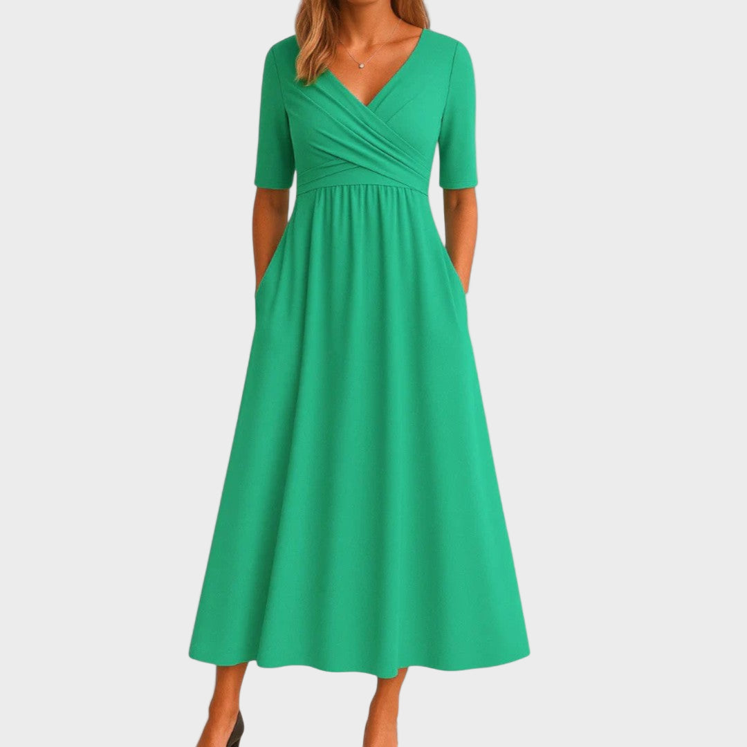 Rochia Leona este concepută pentru a oferi eleganță și confort discret. Croiul ușor evazat, cu detalii din material textil în zona abdomenului, asigură un confort sporit, fără a perturba linia rochiei. Materialul este moale și ușor elastic, permițând libertate de mișcare, rămânând în același timp elegant. Alegerea perfectă pentru evenimente de vară, sărbători sau zile de lucru elegante.