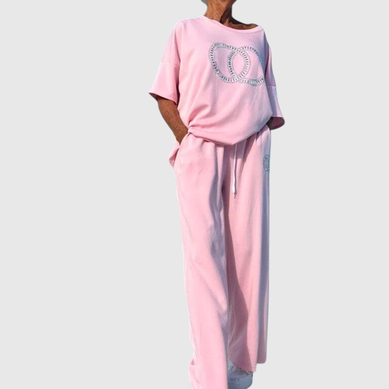 - Detalii: Decolteu rotund, mâneci scurte, pantaloni lejeri