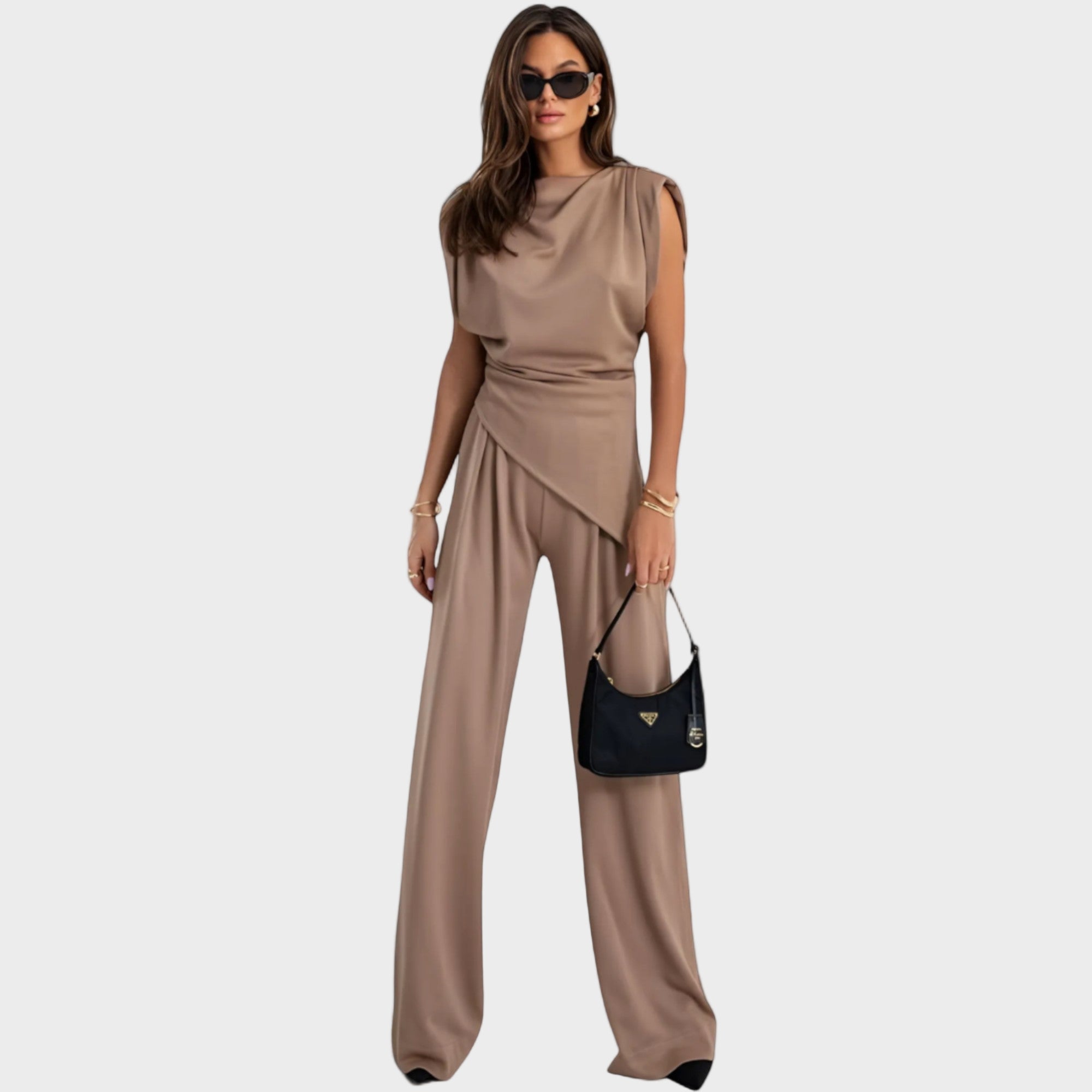 Eleganță sculpturală cu o notă modernă: Setul Sofia combină un top asimetric cu pantaloni cu croi larg pentru o siluetă elegantă și lejeră. Perfectă pentru ocazii speciale sau pentru o actualizare ușoară a look-ului tău de zi cu zi.